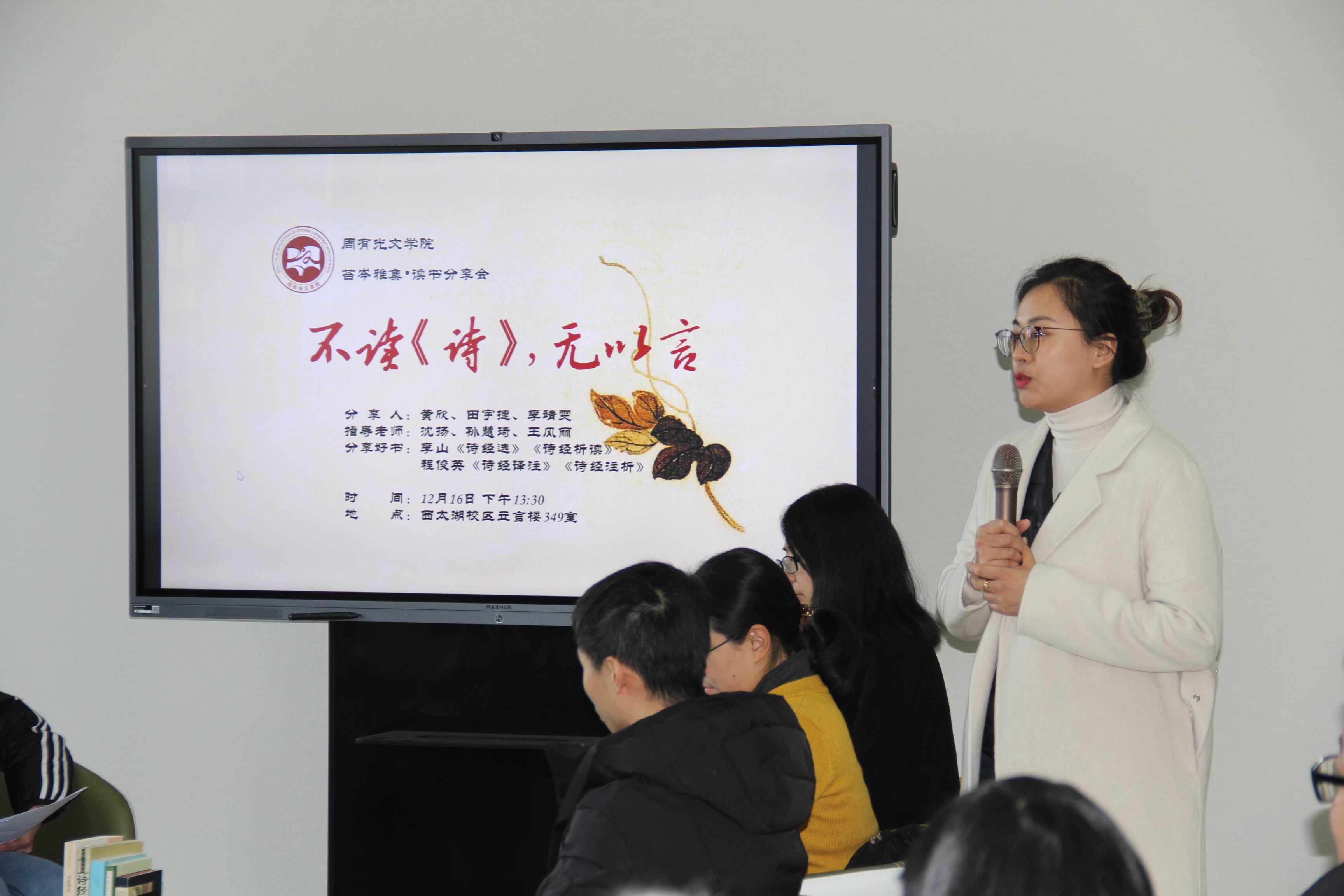 “苔岑雅集·读书分享会”在西太湖校区立言楼349室顺利举行。本次读书会主题为“不读《诗》,无以言”,指导老师沈扬、孙慧琦、王风丽带领3位20级新生黄欣、田宇捷、李靖雯分享读书心得。读书会由院长助理、中文系主任王丹老师主持,学院全体教师及大一学生参加。