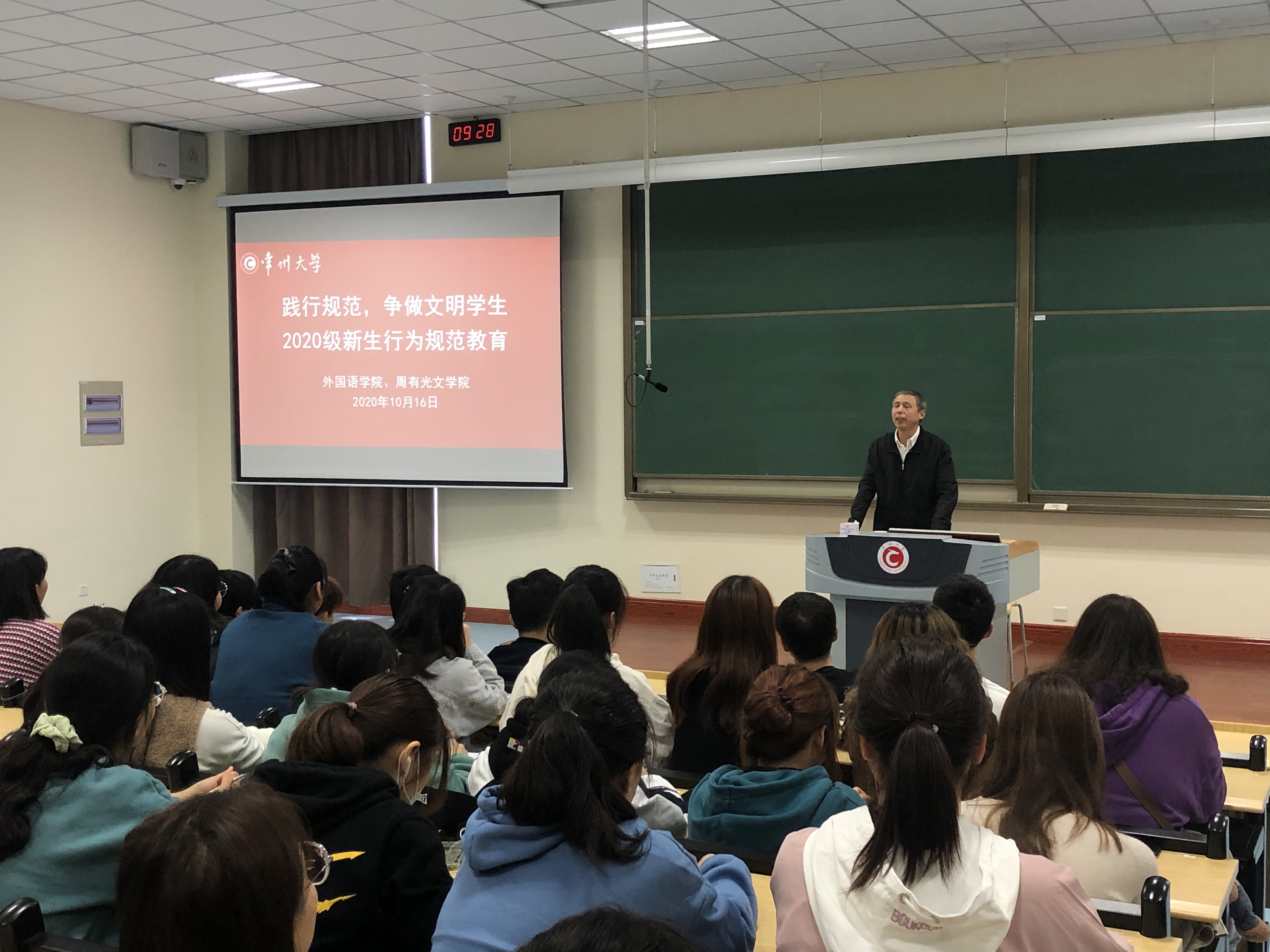 为帮助新生更好地理解学校的规章制度,养成良好的行为习惯,10月16日上午,外国语学院、成人直播 在教学楼X2阶开展了新生行为规范教育讲座,邀请了关工委赵新华老师、学生处黄龙老师主讲,成人直播 党委书记焦洁庆主持会议,2020级全体新生参加。
