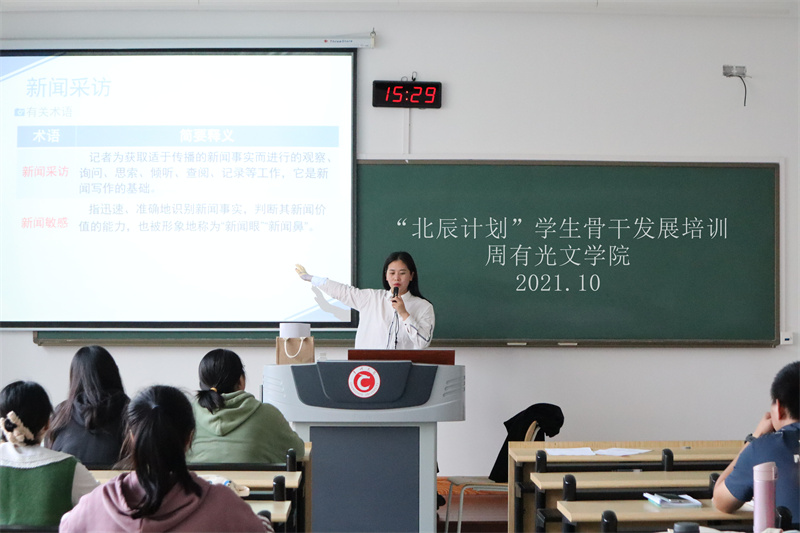 为进一步提高学院学生骨干思想政治素质和工作业务能力,10月26日下午,成人直播 “北辰计划”学生骨干发展培训工作在在立德楼X202正式启动。首场培训内容为“新闻写作和摄影能力提升”,由成人直播 王春晓老师主讲,学院全体学生党员、宣传委员以及新闻媒体中心全体成员参加培训。