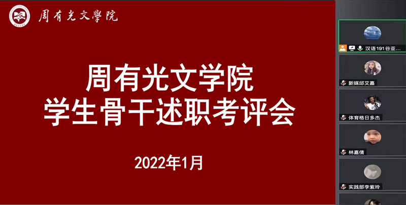 1月14日下午,成人直播 团委学生会于线上召开学生骨干述职考评会,学生会执行主席谷亚杰、林嘉倩、张研,团委副书记姚娜、王瑞担任评委,院团学各部门部长参加考评会。