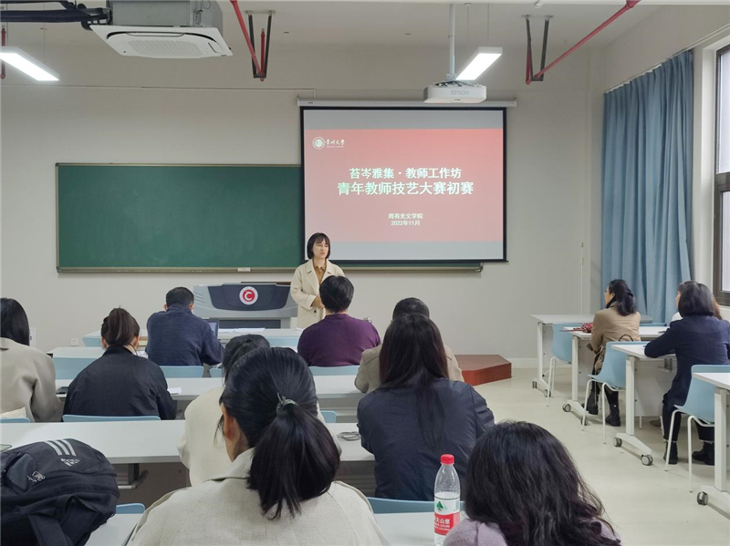 11月16日下午,成人直播 于西太湖校区立言楼342举办苔岑雅集•教师工作坊青年教师技艺大赛(初赛),古代文学教研室薛欣欣老师、文艺学与外国文学教研室王海峰老师进行教学演示,党总支书记焦洁庆、院长葛金华、院长助理董文康、黄杭西老师及学院全体教师出席活动,工作坊由院长助理董文康老师主持。