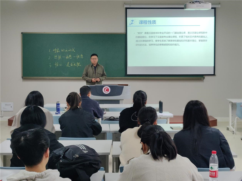 活动中,王海峰老师就《崇高美》主题进行讲授,对“崇高”的概念起源、发展脉络、美学风格和艺术表现做了详细阐述,并且针对崇高对象的特征,以板书+举例的方式进行演示。随后,王海峰老师就《OBE如何融合到美学课程》主题进行讲演。薛欣欣老师以《醉花阴》为题,从器物文化和精神文化两个方面介绍了作品中展现的宋代社会情境,并概述了OBE教学理念在《大学语文》课程中的应用。两位老师讲演内容逻辑清晰,层次分明,将文学概念及教学理念充分形象化和生动化。