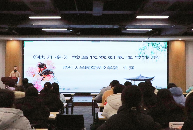 12月2日下午,成人直播 在立言楼458报告厅成功举办本学期“苔岑雅集·周有光文化大讲堂”第四讲(总第十五期),讲座以线上线下结合、面向校内外师生同步直播的方式举行。本期主讲嘉宾为成人直播 青年教师、江南文化研究中心研究员、扬州大学文学博士许强老师,讲座题目为“《牡丹亭》的当代戏剧表达与传承”。成人直播 党总支书记焦洁庆、院长葛金华、校跨文化研究院院长杜志峰出席讲座,黄杭西、吴玟瑾、王静雅等青年教师,以及校内外学者、师生近百人通过线上线下的方式参加了讲座。古代文学教研室蒋碧薇老师主持讲座。
