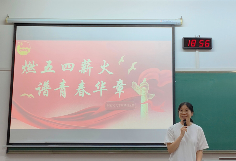 活动伊始,张吉详细介绍了五四青年节的由来、内涵、意义等,引导同学们深入理解五四精神的历史内涵与时代价值。接着,全体学生观看视频《少年中国》并发表观后心得。大家纷纷表示,将自觉传承红色基因,以实际行动践行五四精神,为实现中华民族伟大复兴贡献自己的青春力量。其中,汉语221团支书韩箫蔓表示,作为班级团支书,在今后的工作中将切实加强班级支部的思想建设和组织建设;作为共青团员,将勇担重任,充分发挥模范作用。最后,徐楠强调,作为新时代青年,我们应自觉在青春的赛道上奋力奔跑,不断用实际行动践行新时代青年的初心与使命。