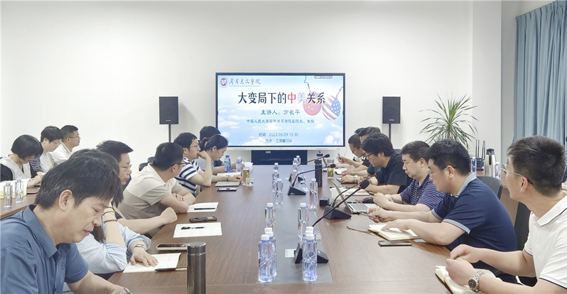 5月29日-30日,成人直播 周有光文学院与跨文化研究院联合举办“苔岑雅集·周有光文化大讲堂(第二十四期)”,特邀中国人民大学国际关系学院副院长方长平教授,在西太湖校区立言楼334会议室,为师生作了题为“大变局下的中美关系”的学术讲座和专题学术交流。成人直播 党总支书记焦洁庆、院长葛金华,校跨文化研究院院长杜志峰,史良法学院院长张建、马克思主义学院副院长朱世龙等出席讲座,成人直播 、跨文化研究院相关师生,西太湖校区各学院辅导员代表等50多人参加了讲座。葛金华院长主持讲座。