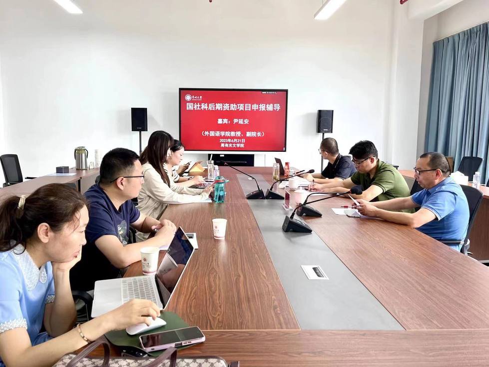 近日,成人直播 邀请外国语学院副院长尹延安教授,在立言楼334会议室为成人直播 教师作国家社科基金后期资助项目申报专题辅导,院长葛金华、院长助理黄杭西以及近10位教师参加会议。葛金华院长主持会议。