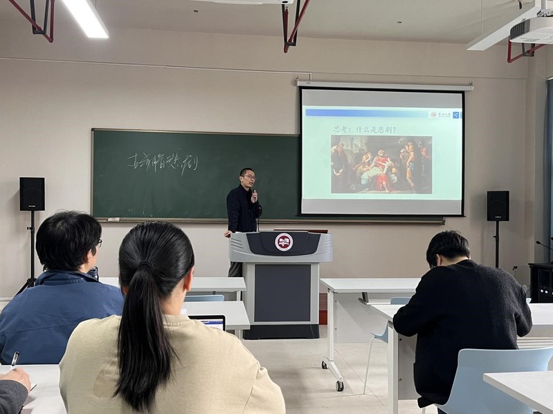 活动中,裔一以《新典范与新正宗(下)——朱彝尊》为题,围绕浙西词派代表朱彝尊的作品《桂殿秋》展开详细解读。她通过词义解读、主题分析和风格对比,重点阐释了朱彝尊“清空雅醇”艺术风格和“宜于宴嬉逸乐,以歌咏太平”文学主张。黄杭西则带来了古希腊悲剧《俄狄浦斯王》的教学演示,他介绍了该作品的戏剧主题、冲突、艺术和时代价值,并就文本细读与批评进行进一步解读。两位老师由浅入深,寓情于理,通过具体的文学形象和文本解读,引入相关的文学主张和批评理论,引人深思,富有启迪。