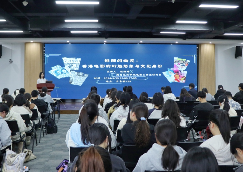 4月19日,成人直播 在立言楼458报告厅成功举办“苔岑雅集·周有光文化大讲堂”第四十讲。本期主讲嘉宾为成人直播 电影工作室主任赵雅婷老师,讲座题目为“徘徊的幽灵:香港电影的幻魅想象与文化身份”。成人直播 党总支书记焦洁庆、院长葛金华、院长助理黄杭西,校内外学者、师生近两百人参加讲座。文艺学与世界文学教研室张登峰老师主持讲座。