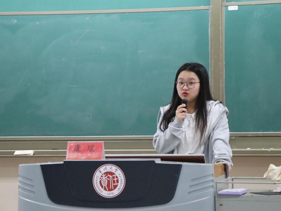虞瑶从苏区精神解析、苏区五次反围剿情况和苏区精神的深刻内涵三个方面展开讲述。首先,虞瑶借助一段影像资料引出主题,随后举例介绍苏区精神的表现形式,并深入浅出地讲解了五次反围剿的过程和结果,强调了苏区精神在党的发展历程中展现的重要地位。最后,虞瑶再次阐释了苏区精神的深刻内涵,及其对学生精神塑造的重要意义,并激励广大学生骨干们自觉以苏区精神为指引,在日后的工作学习中加强精神建设,提升工作能力。