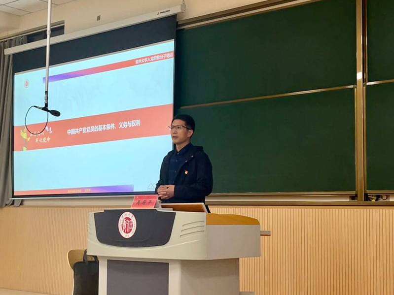 ▲外国语学院党总支副书记蔡震宇讲授《践行四讲四有弘扬时代精神》专题党课