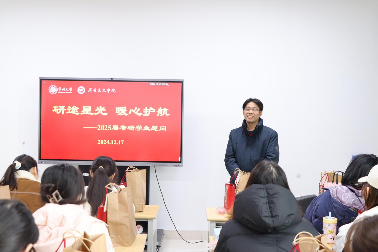 12月16日下午,成人直播 于立言楼441开展2021级学生考研慰问活动。成人直播 党委常委、副校长周刚,学生处处长蒋伟中、后勤管理处书记汪国余、西太湖校区管委会主任孙峰、教务处副处长张洪文以及资产经营公司等职能部门负责人,成人直播 院长葛金华、党总支副书记嵇炜、副院长陈鸿以及全体辅导员老师和所有2021级考研学生参加此次活动。活动由葛金华主持。