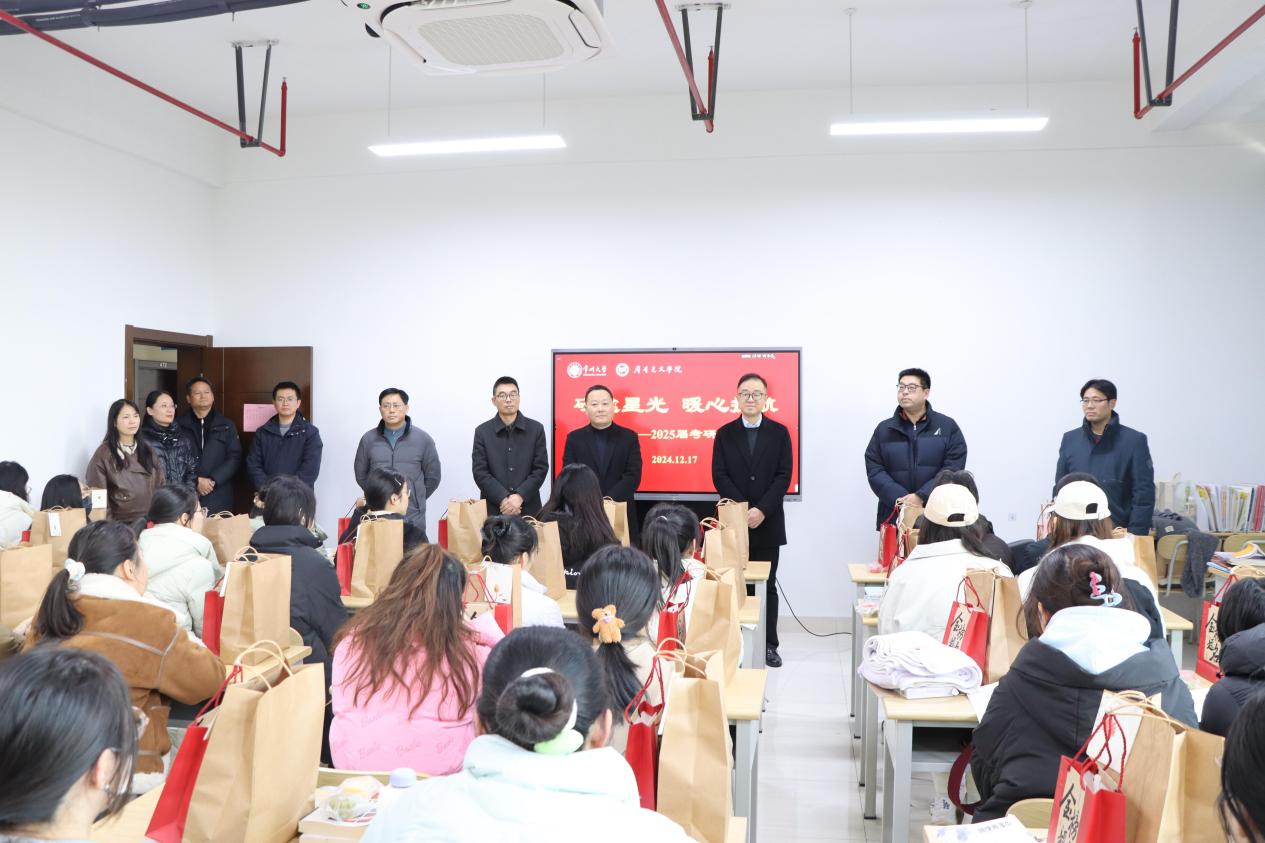 周刚向同学们致以亲切的问候和诚挚的关心。他强调,学校一贯以来重视考研工作,及时关心同学们的备考情况及身心健康。此行也是受学校党政领导班子的委托而来,看望即将“奔赴战场”的同学们。他勉励大家在备考的最后时间要奋力拼搏,注重劳逸结合,做到战略上藐视,战术上重视。各职能部门负责人也分别向同学们送上了诚挚的祝福。