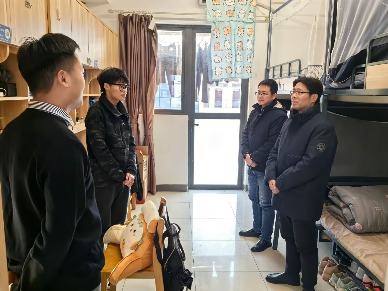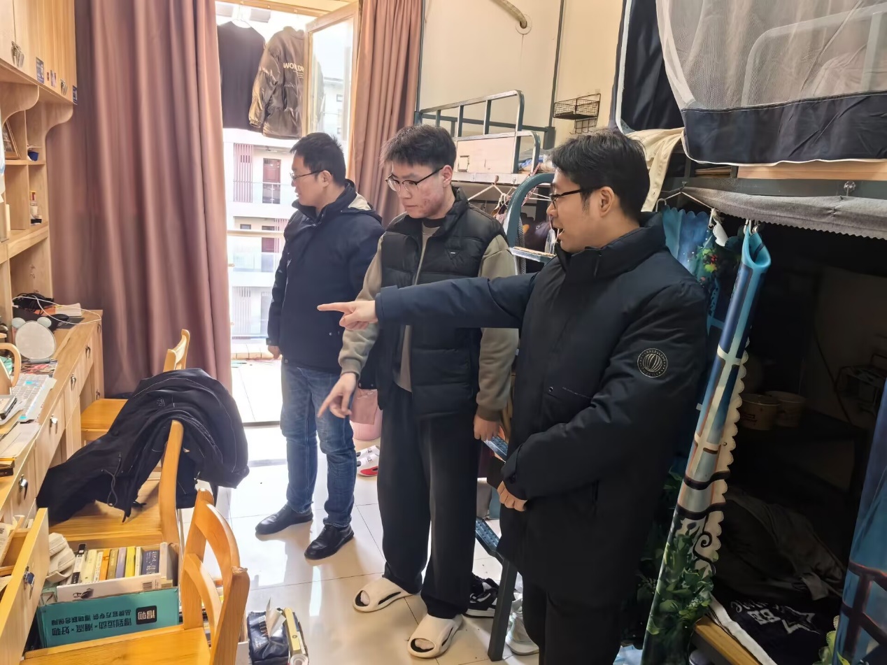 12月19日下午,学院院长葛金华、党总支副书记嵇炜以及全体辅导员走访西太湖校区1号楼和3号楼的部分学生宿舍。