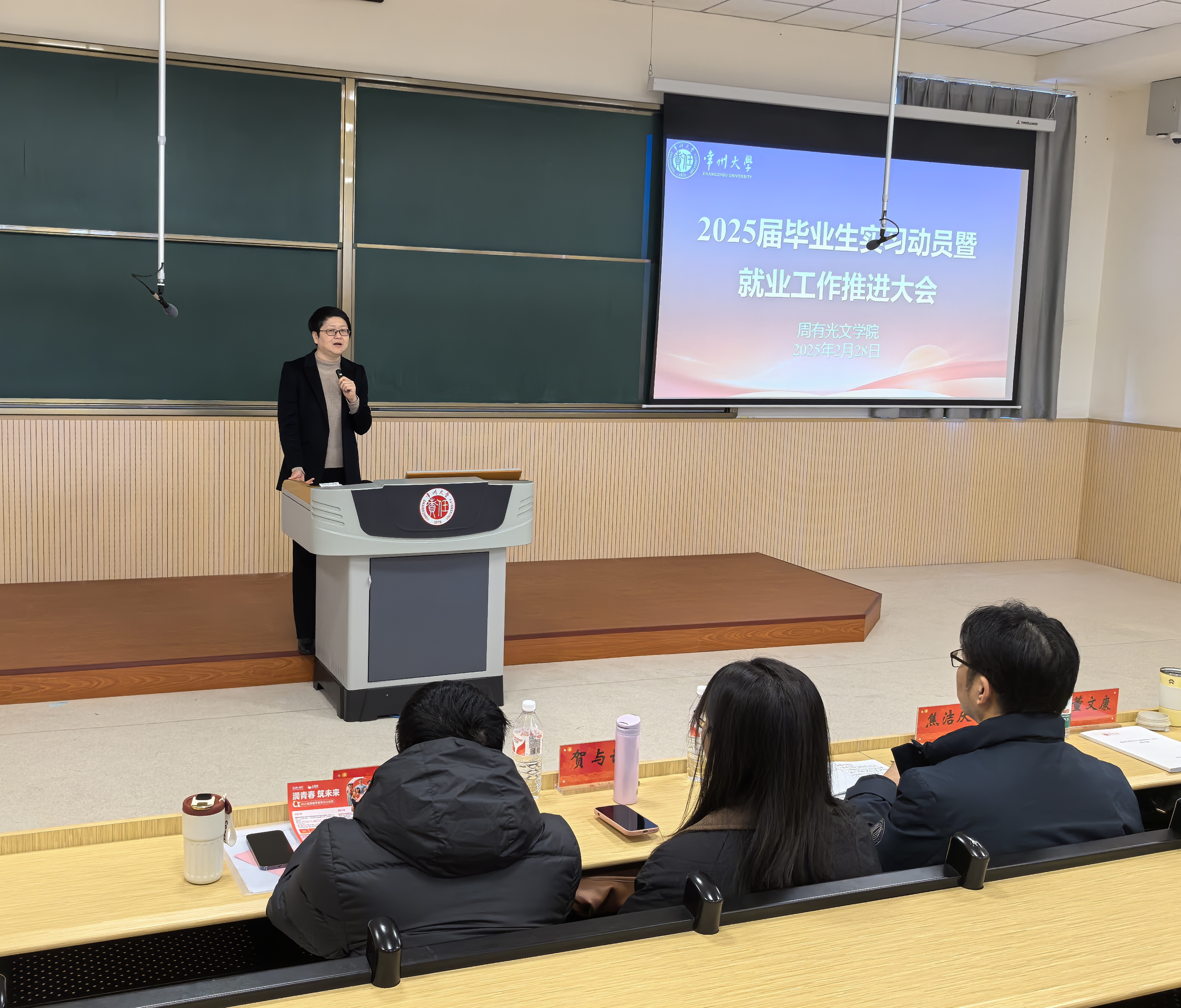 2月28日下午,成人直播 在西太湖校区立功楼一阶成功举办2025届学生毕业实习动员暨就业工作推进大会。学院党总支书记焦洁庆、院长葛金华、院长助理董文康、中文系系主任贺与峥、毕业班班主任、辅导员及全体25届毕业班学生参加会议。会议由党总支副书记嵇炜主持。
