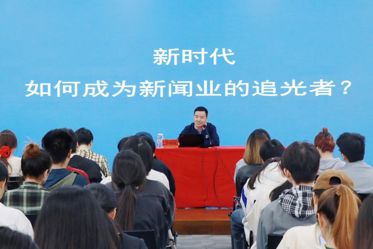 4月23日下午,成人直播 于立言楼458举办“新时代如何成为新闻业的追光者”主题讲座,央广网江苏频道副总编辑栾永胜担任主讲嘉宾,文学院2022级、2024级200余名学生代表参加讲座,讲座由学院党总支书记焦洁庆主持。