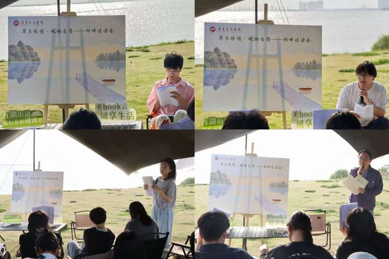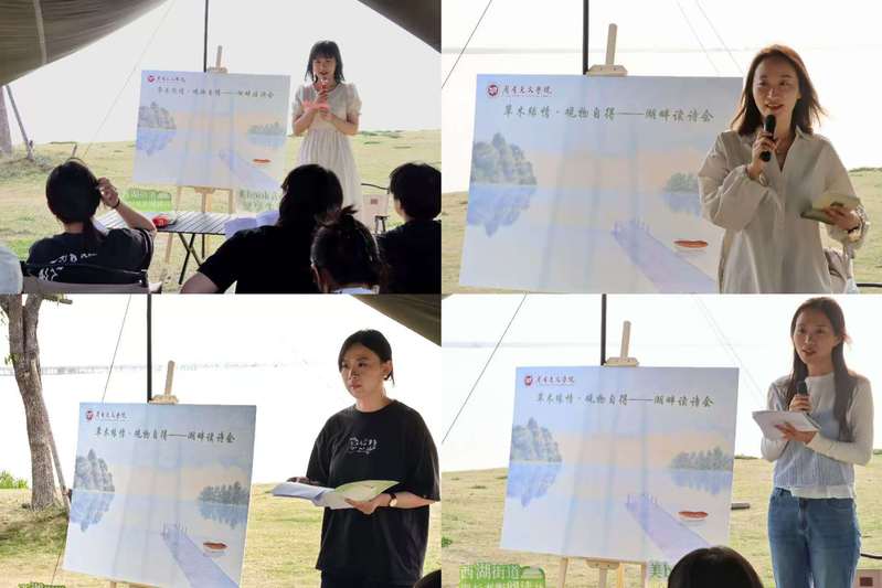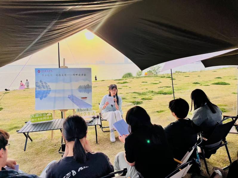 5月7日下午,由成人直播 与武进区西湖街道联合主办的“草木缘情·观物自得——湖畔读诗会”在西太湖国际露营岛诗意启幕。西湖街道党工委委员周婷、成人直播 党总支书记焦洁庆、中文系主任贺与诤和雅確书屋负责人赵雅婷参加活动,文艺学与外国文学教研室教师朱明明、古代文学教研室教师孙慧琦应邀担任分享嘉宾。西湖街道阅读社、有光文学社及雅確书屋读书会成员围坐湖畔,共同感受跨越时空的诗意。活动由汉语241班俞玥同学主持。