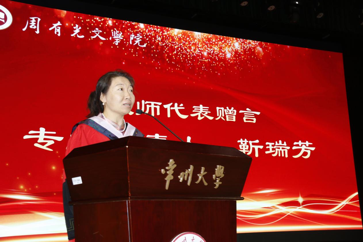 导师代表、专业负责人靳瑞芳老师给毕业生赠言。她在赠言中回顾了与同学们四年来的相处时光,期望同学们以坚韧和执着直面人生,不轻信盲从,不固步自封,以豁达胸怀接纳平凡,始终心存希望、责任与担当,切记自己是常大人、有光人,她勉励大家要努力成为社会的栋梁,希望同学们眼里有光、心中有爱、灵魂有家。