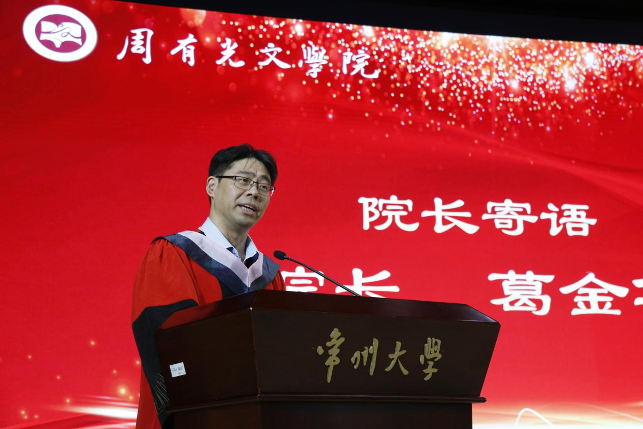 葛金华院长以“把焦虑转换为动能,让我们始终相信人民的能动性”为题,代表学院寄语全体毕业生。他聚焦当下大学生普遍存有的焦虑情绪,鼓励毕业生们将焦虑转化为动能,在转化中首先践行“先就业再择业”的理念,即在经济上先求相对独立,实现“利用容身”,再图未来更远更大的发展。他希望毕业生们能和学校、社会、国家,乃至世界一起,“始终相信人民的能动性”,依靠人民创新创造的力量突破低迷的局面。从语言服务社会、文学服务社会的双重维度,以数智文献、大数据为工具,深耕文学创作,参与文化、文旅产业,在再学习、再生产和再行动中达至良性循环。以主动、生动的追求收获更进一步和更加美好,最终达到“一路有光”。