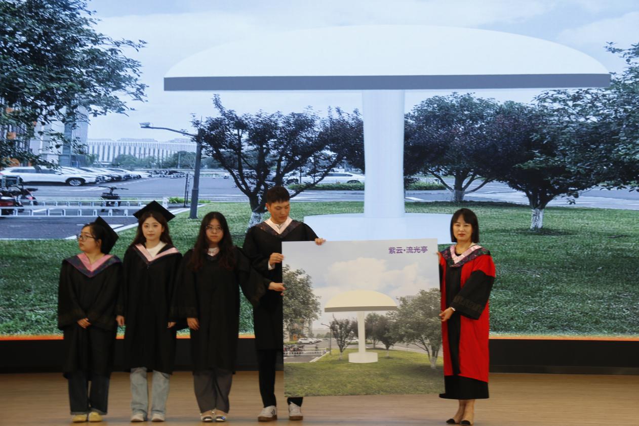 毕业生为感谢学院栽培,向学院赠送了一份特别的毕业礼物——“紫云·流光亭”。亭型与原白云校区北区西园蘑菇小亭一致。名字寓主动传承城市、学校文脉,共创流光溢彩未来之意。“紫”意即“紫藤”,常州古城白云溪畔藤花旧馆为苏东坡终老地,馆内有其手植紫藤树,自古即是文人雅集的核心意象,每朵紫藤花都是一个优雅而丰富的文学灵魂;“云”意即“白云”,既有轻盈飘逸、超然物外之意,也表达了对承载着无数青春足迹白云校区的纪念;“流光”则取自蒋捷词《一剪梅·舟过吴江》中的“流光容易把人抛,红了樱桃,绿了芭蕉”句,意为时光虽易逝,更当奋力拼搏共创流光溢彩的未来。院长助理董文康代表学院接受了这份珍贵礼物,并表示将珍藏这份美好祝愿。