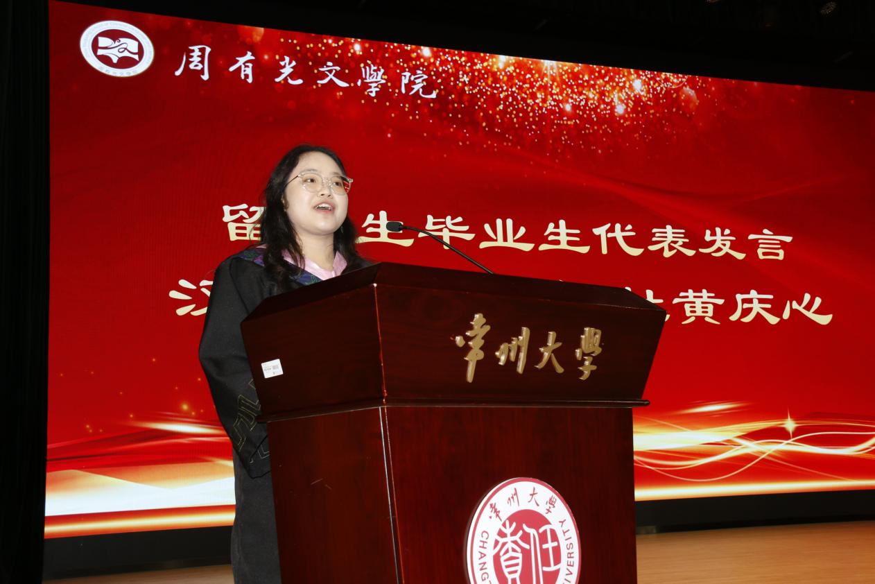 汉语213班杜黄庆心同学代表留学毕业生发言。她在发言中回顾了留学路上收获的知识与跨国情谊,感谢各位老师的悉心教导和精心栽培。她祝愿同学们永葆赤子之心,勇敢追逐心中的梦想,在人生的舞台上绽放独特的光芒。