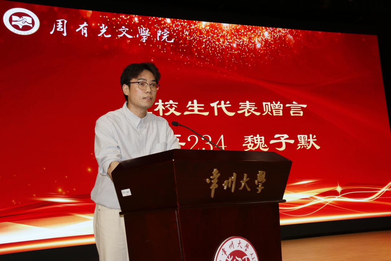 汉语234班魏子默同学作为在校生代表赠言。他首先向学长学姐们表达诚挚谢意,他希望大家要向学长们学习,以清醒的认知在现实与理想之间寻求平衡,并呼吁同学们以学子为榜样,以重塑自我的魄力,勇敢突破时代内卷带来的发展桎梏。