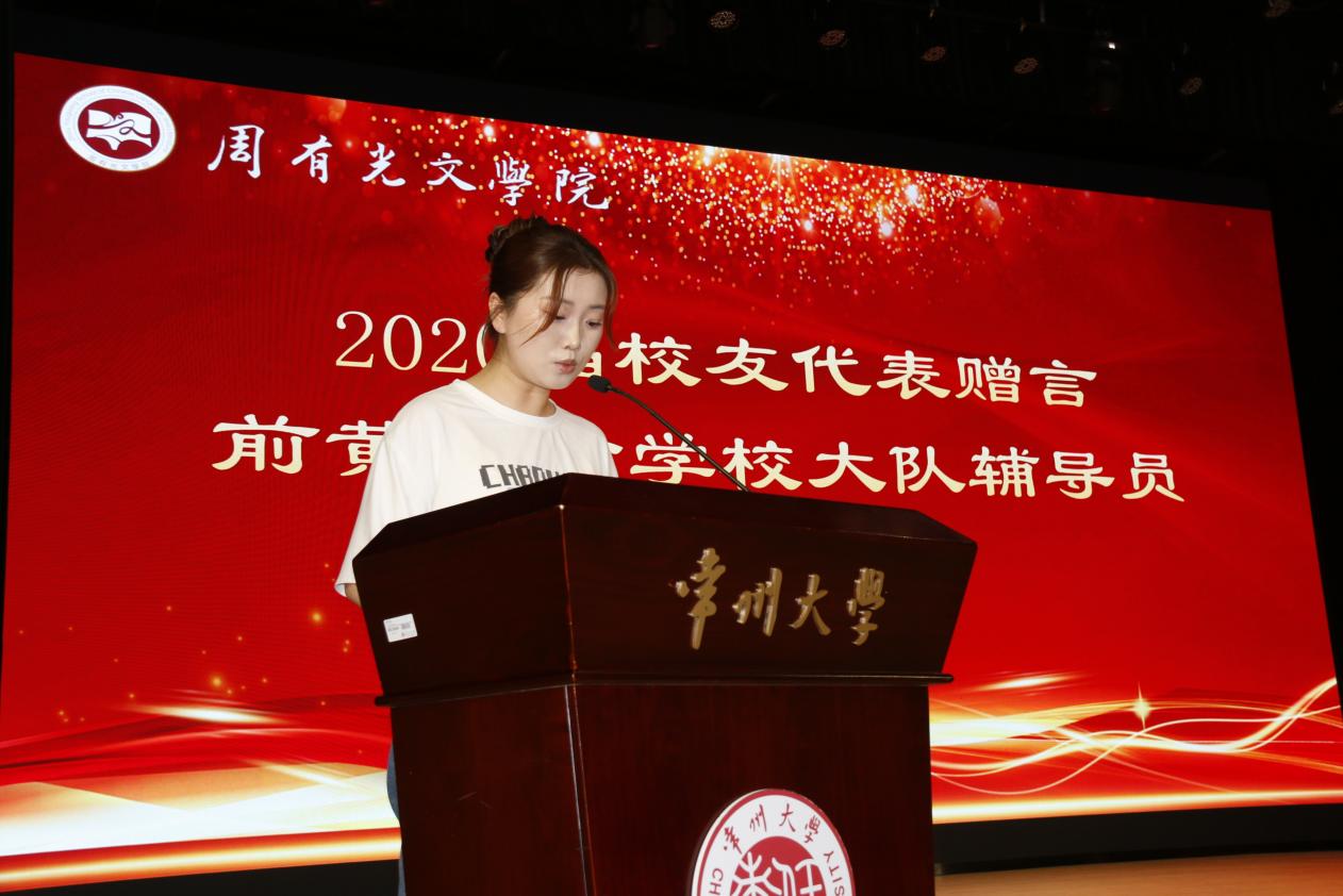 2020届校友、前黄实验学校大队辅导员张雪钰给毕业生赠言。她在赠言中首先分享了成长心得。她向同学们阐释了专业的“无用之用”,希望毕业生们充分利用专业赋予自己的人文情怀、思辨能力和专业技能,将所学转化为社会价值,最终收获美好人生。