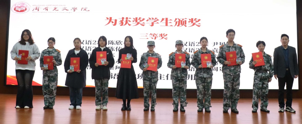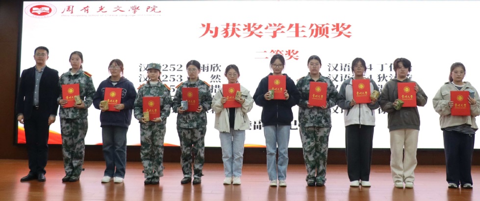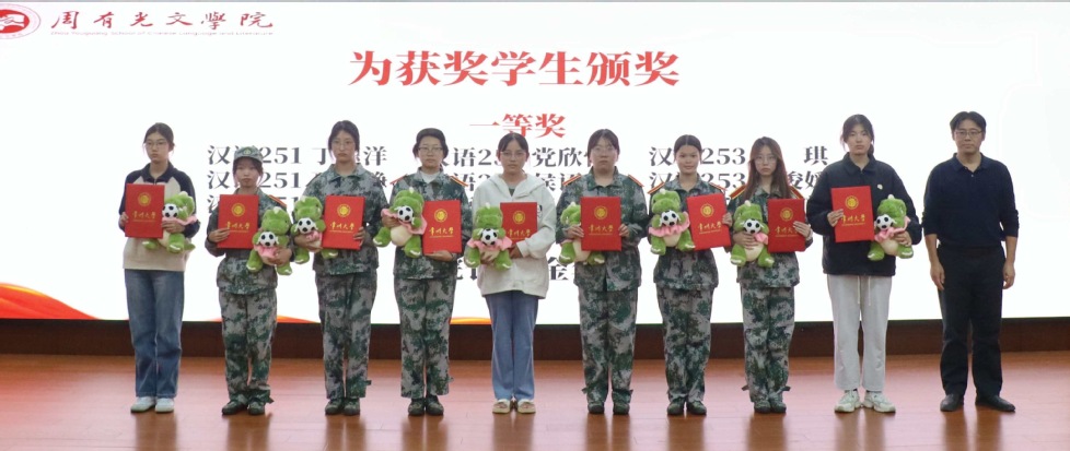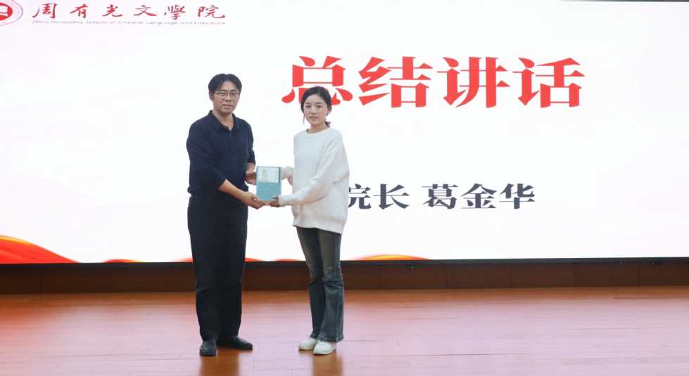 会上,为在首届“有光”征文大赛中脱颖而出的优秀学子进行了表彰。本次大赛2025 年新生全员参加比赛,共评选出奖项 66 名,其中一等奖19名、二等奖10 名、三等奖37名。在激昂的乐曲和全场热烈的掌声中,老师们为获奖同学颁发了荣誉证书,并赠送了常州城市文创精美礼品。获奖代表汉语254班仓若研同学分享了她从其他专业转入成人直播 汉语言文学的心路历程,她表示汉语言文学专业最打动她的是文字与心灵的共鸣。葛金华向仓若研赠送了《文选译注》。